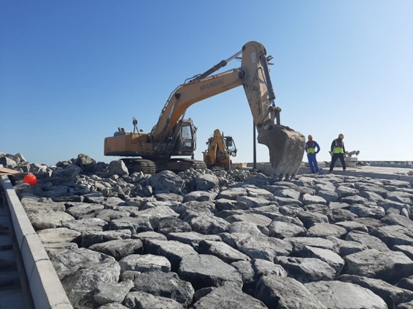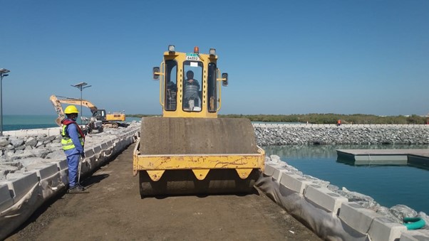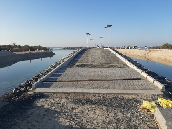 various elements such as dredging, a causeway, breakwater, paved access road with kerbs and